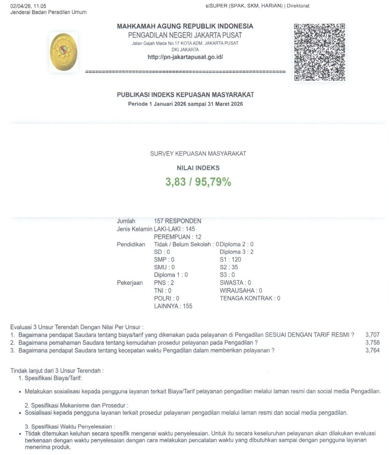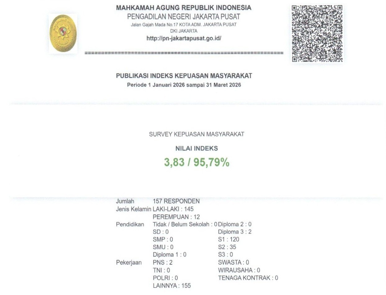 PN Jakarta Pusat mendapatkan IKM 95.79% (skala 100%) atau 3.83(skala 4) pada Triwulan I Tahun 2026. Terimakasih atas penilaian yang anda berikan. Masukan anda sangat bermanfaat untuk kemajuan unit kami.