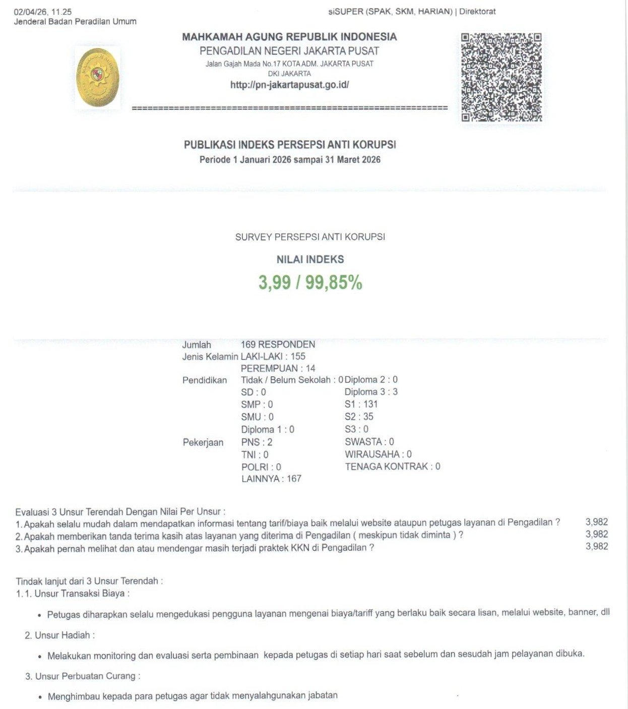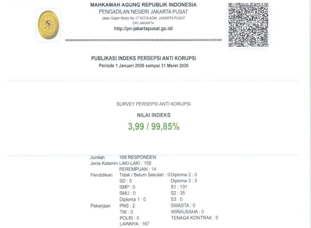 PN Jakarta Pusat mendapatkan IPK 99.85% (skala 100%) atau 3.99(skala 4) pada Triwulan I Tahun 2026. Terimakasih atas penilaian yang anda berikan. Masukan anda sangat bermanfaat untuk kemajuan unit kami.