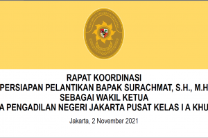 Selasa, 2 November 2021. Bertempat di Ruang Command Center Lantai 4, Gedung Pengadilan Negeri Jakarta Pusat Kelas I A Khusus, dilaksanakan Rapat Koordinasi Persiapan Pelantikan Wakil Ketua Pengadilan Negeri Jakarta Pusat Kelas I A Khusus, Bapak Surachmat, S.H., M.H., yang dipimpin oleh Ketua, Bapak Muhammad Damis, S.H., M.H., selaku Pelindung/ Penasehat dengan…