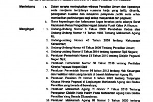 Dalam rangka meningkatkan Wibawa dan Kedisiplinan Aparatur Peradilan di lingkungan Pengadilan Negeri Jakarta Pusat Kelas I A Khusus Peradilan Umum, menjamin terciptanya suasana kerja yang Tertib dan Dinamis, serta pemanfaatan teknologi informasi dalam rangka peningkatan kualitas kinerja, Ketua Pengadilan Negeri Jakarta Pusat Kelas I A Khusus Memutuskan: Menetapkan Surat Keputusan…