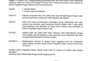 I N S T R U K S I : Memperhatikan Surat Ketua Mahkamah Agung Nomor : MA/KUMDIL/P.01/II/2002 tanggal 15 Februari 2002, tentang Petunjuk Penerimaan Tamu, Surat Edaran Ketua Mahkamah Agung RI Nomor 03 Tahun 2010 dan 08 Maret 2010 tentang Penerimaan Tamu, dan Sesuai dengan Intruksi Ketua Pengadilan Negeri…