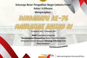 Keluarga Besar Pengadilan Negeri Jakarta Pusat Kelas I A Khusus Mengucapkan : "Dirgahayu Mahkamah Agung Republik Indonesia Ke-76. Kami Bangga menjadi bagian dari Mahkamah Agung Republik Indonesia. MARI Menjadi Lebih Baik". "Memantapkan Kemandirian Badan Peradilan Melalui Pelayanan Hukum Berbasis teknologi Informasi Pada Masa Pandemi"