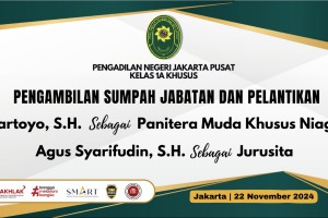 Jumat, 22 November 2024 bertempat di Ruang Auditorium Lantai 7 Gedung Pengadilan Negeri Jakarta Pusat Kelas IA Khusus, Ketua Pengadilan Negeri Jakarta Pusat Kelas IA Khusus Bapak Dr. Rudi Suparmono, S.H., M.H. mengambil sumpah jabatan dan melantik Bapak Hartoyo, S.H. sebagai Panitera Muda Khusus Niaga dan Bapak Agus Syarifudin, S.H.…