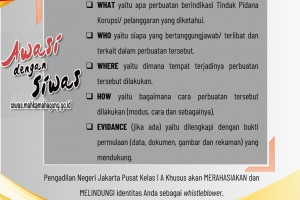 Sebagai Tindak Lanjut Evaluasi Kinerja Pengadilan Negeri Jakarta Pusat Kelas I A Khusus oleh Badan Pemeriksa Keuangan (BPK), dengan ini diinformasikan : Jika Anda Melihat atau Mengetahui adanya Dugaan Suap, Gratifikasi, Tindak Pidana Korupsi atau Bentuk Pelanggaran Lainnya yang dilakukan oleh Pejabat/ Hakim/ Panitera Pengganti/ Juru Sita/ Jurusita Pengganti/ Staf Pengadilan…