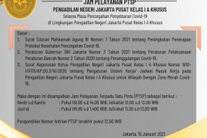 Selama masa Pencegahan Penyebaran Covid-19, dengan ini diinformasikan kepada Para Pihak/ Kuasa Hukum/ Masyarakat Pencari Keadilan di Pengadilan Negeri Jakarta Pusat Kelas I A Khusus, bahwa Jam Operasional Pelayanan Terpadu Satu Pintu (PTSP) Pengadilan Negeri Jakarta Pusat Kelas I A Khusus berubah dan menyesuaikan, kecuali untuk pelayanan yang bersifat mendesak seperti Upaya…