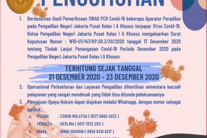 P E N G U M U M A N. Sehubungan dengan tindak lanjut Penanganan Penyebaran Covid-19 pada Pengadilan Negeri Jakarta Pusat Kelas I A Khusus, dan berdasarkan Surat Keputusan Nomor : W10.U1/147/KP.00.3/XII/2020, Tanggal 17 Desember 2020, dengan ini diinformasikan kepada Satuan Kerja Terkait, Para Kuasa Hukum, dan Seluruh Masyarakat Pencari Keadilan, bahwa…