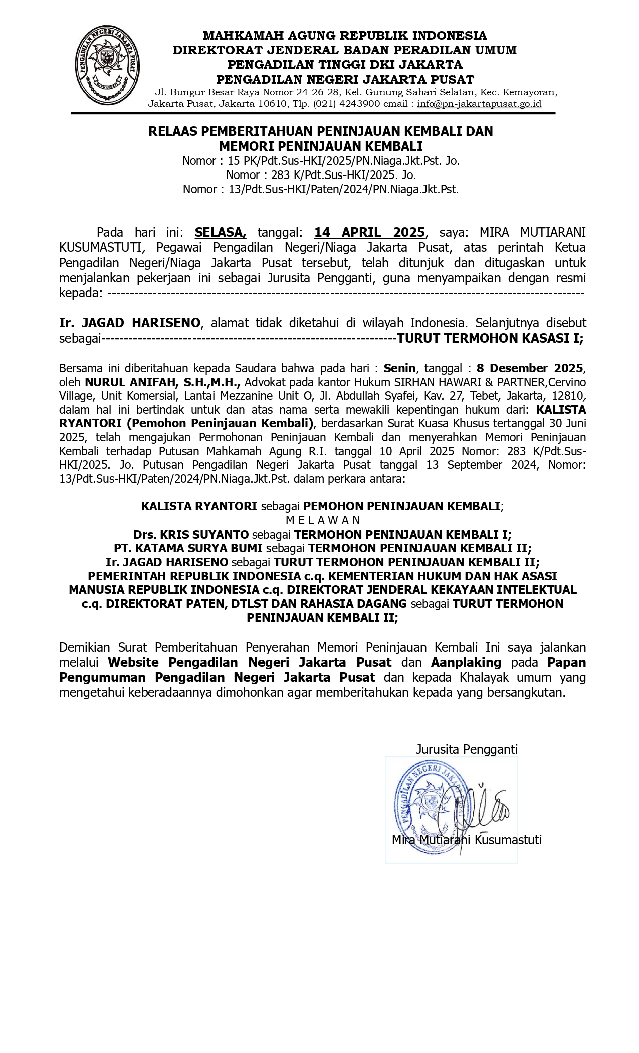 Rabu, 24 April 2024. Bertempat di Ruang Sidang Anak Lantai 7 Gedung Pengadilan Negeri Jakarta Pusat Kelas IA Khusus, dilaksanakan Kebaktian Ibadah Umat Kristiani dengan Tema Khotbah Matius 11:28-30 "Marilah kepada-Ku, semua yang letih lesu dan berbeban berat, Aku akan memberi kelegaan kepadamu. Pikullah kuk yang Kupasang dan belajarlah pada-Ku, karena Aku lemah lembut dan rendah hati dan jiwamu akan mendapat ketenangan. Sebab kuk yang Kupasang itu enak dan beban-Ku pun ringan”.