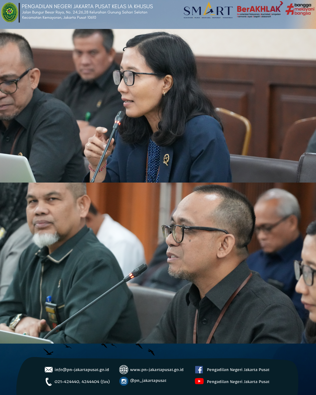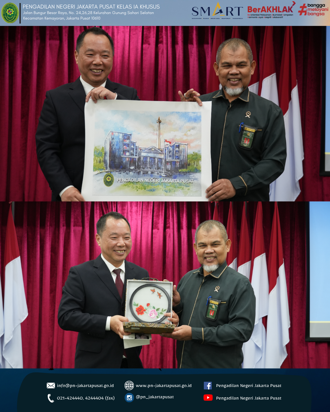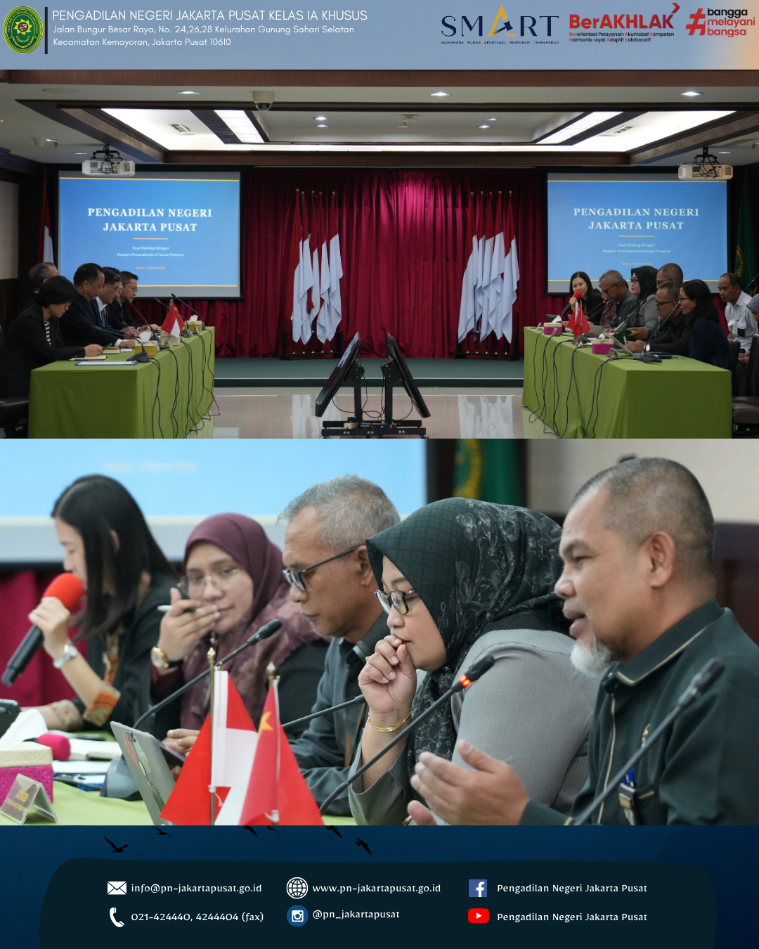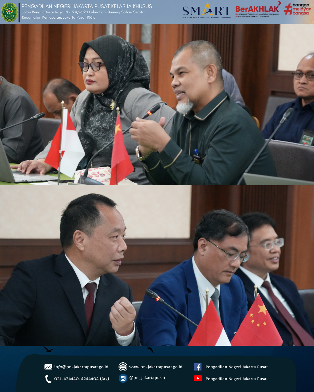 Pengadilan Negeri Jakarta Pusat menyambut baik kegiatan ini sebagai bagian dari komitmen untuk terus membuka ruang kolaborasi dan pertukaran informasi dengan berbagai pihak, baik dari dalam maupun luar negeri. Dengan adanya kegiatan seperti ini, diharapkan dapat memberikan kontribusi positif dalam meningkatkan pemahaman mengenai sistem hukum dan peradilan di Indonesia serta mendorong terciptanya hubungan kerja sama yang konstruktif di masa mendatang. Sebagai lembaga peradilan yang berkomitmen untuk memberikan pelayanan terbaik kepada masyarakat, Pengadilan Negeri Jakarta Pusat terus berupaya meningkatkan kualitas kinerja, profesionalitas aparatur serta transparansi dalam setiap pelaksanaan tugas dan fungsi peradilan. Kegiatan studi banding ini diharapkan dapat menjadi salah satu langkah dalam memperluas wawasan serta memperkuat sinergi antar lembaga dalam mendukung terwujudnya sistem peradilan yang modern dan berintegritas.