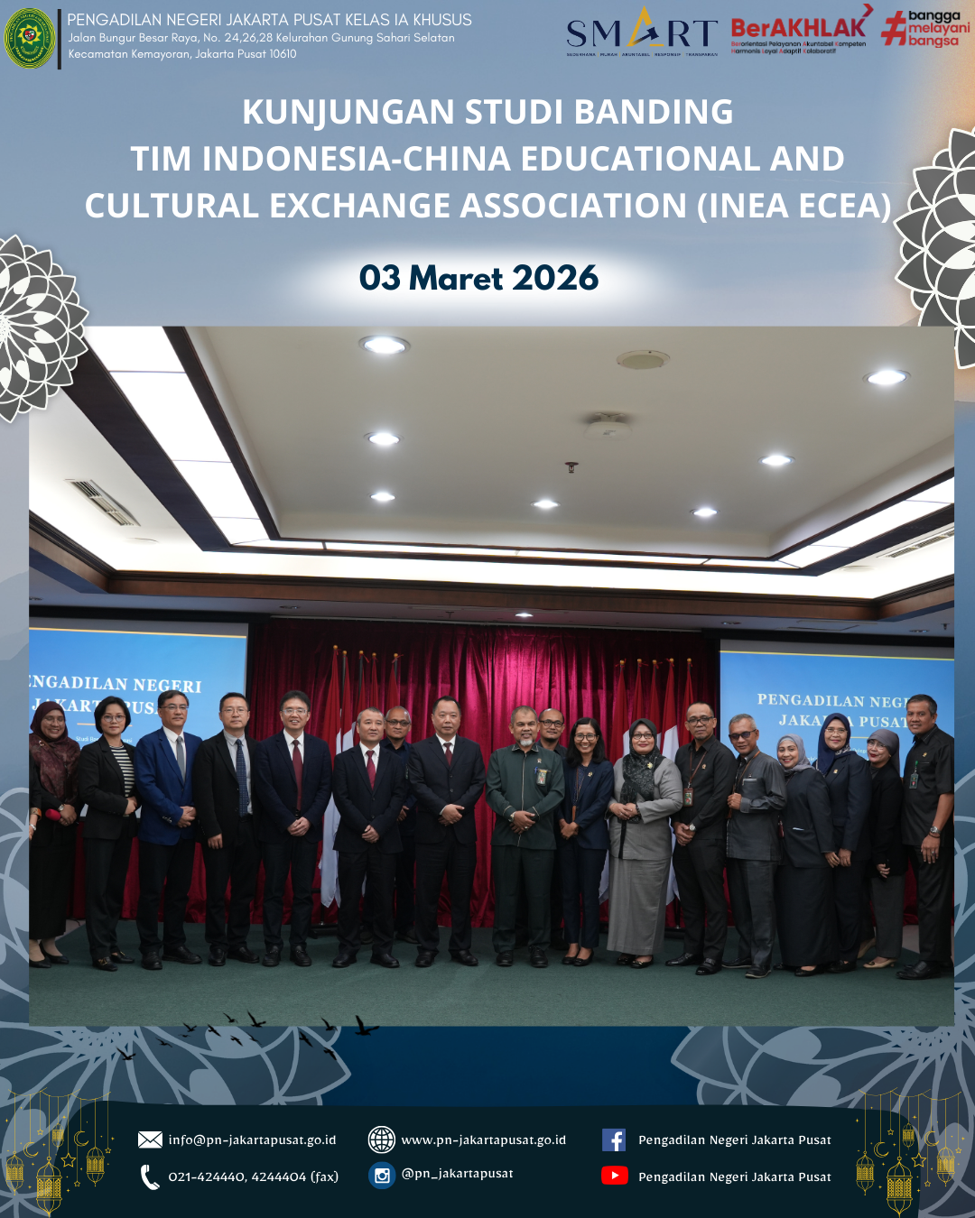 Jakarta — Pengadilan Negeri Jakarta Pusat menerima kunjungan studi banding dari Indonesia-China Educational and Cultural Exchange Association (INEA ECEA) yang dilaksanakan pada Selasa, 3 Maret 2026, bertempat di Ruang Auditorium Lantai 7 Pengadilan Negeri Jakarta Pusat. Kegiatan ini dihadiri oleh jajaran pimpinan, hakim, panitera, serta pejabat struktural Pengadilan Negeri Jakarta Pusat yang ditugaskan secara resmi untuk mendampingi jalannya kegiatan tersebut.