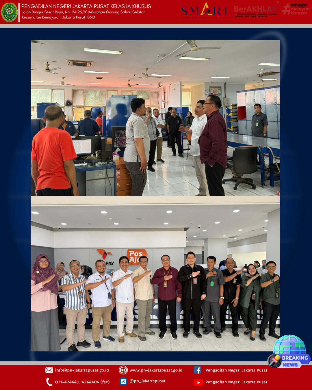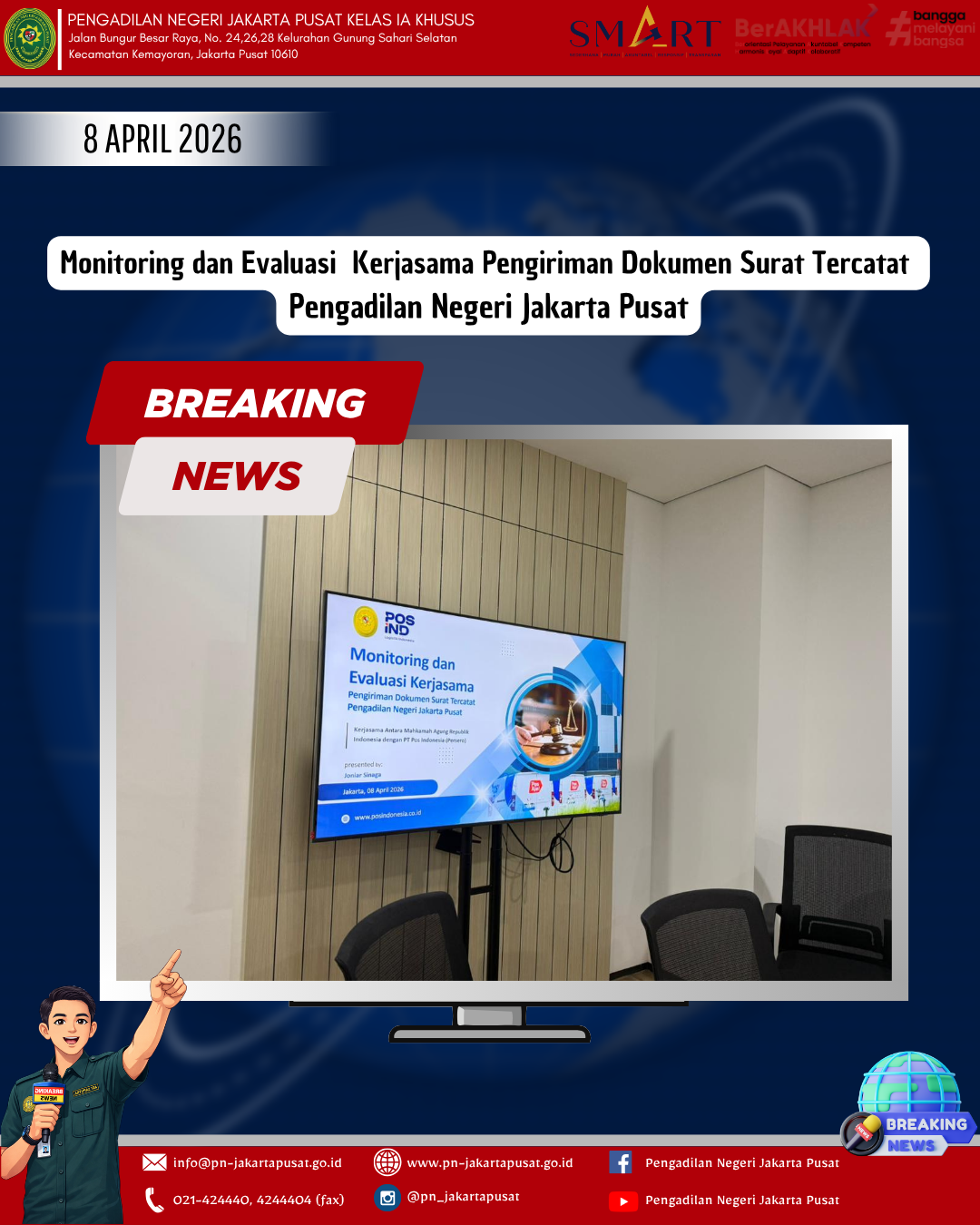 Rabu, 8 April 2026 Pengadilan Negeri Jakarta Pusat melaksanakan kegiatan Monitoring dan Evaluasi Kerjasama Pengiriman Dokumen Surat Tercatat Pengadilan Negeri Jakarta Pusat yang bertempat di PT. POS Indonesia. Kegiatan ini bertujuan untuk memastikan pelaksanaan pengiriman dokumen berjalan secara efektif, tepat waktu dan sesuai dengan ketentuan yang berlaku, serta sebagai upaya peningkatan kualitas pelayanan publik melalui sinergi yang berkelanjutan antara kedua instansi.