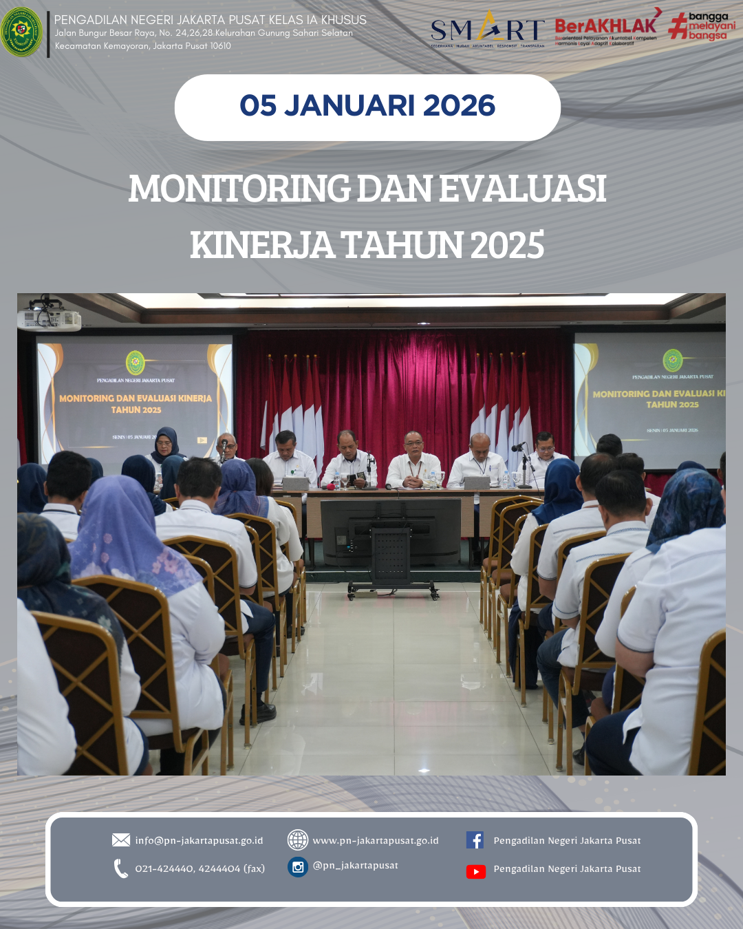Senin, 05 Januari 2026 bertempat diruang Auditorium lantai 7 Gedung Pengadilan Negeri Jakarta Pusat Kelas IA Khusus dilaksanakan kegiatan MONITORING DAN EVALUASI KINERJA TAHUN 2025. Kegiatan ini merupakan bagian dari upaya evaluasi dan penguatan sistem administrasi perkara dan layanan peradilan berbasis teknologi informasi.