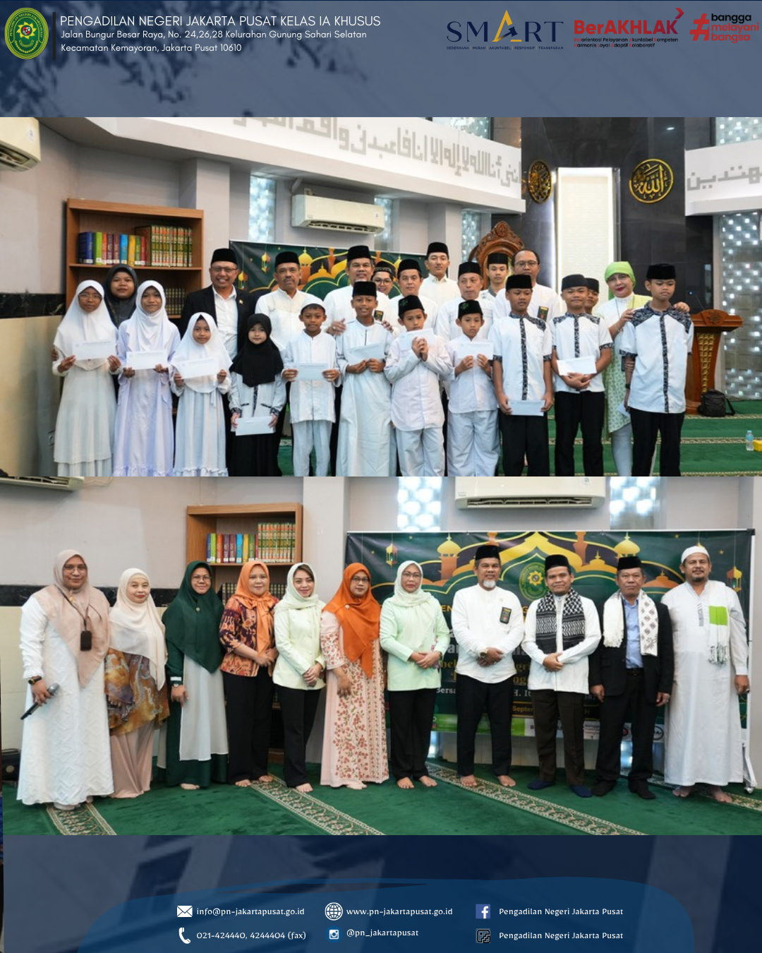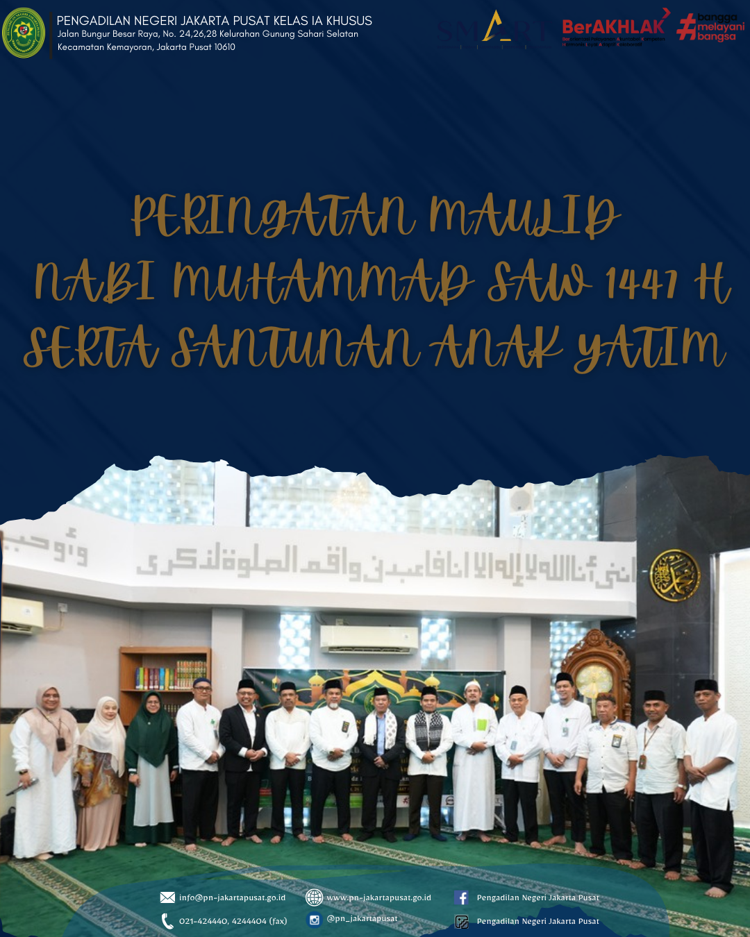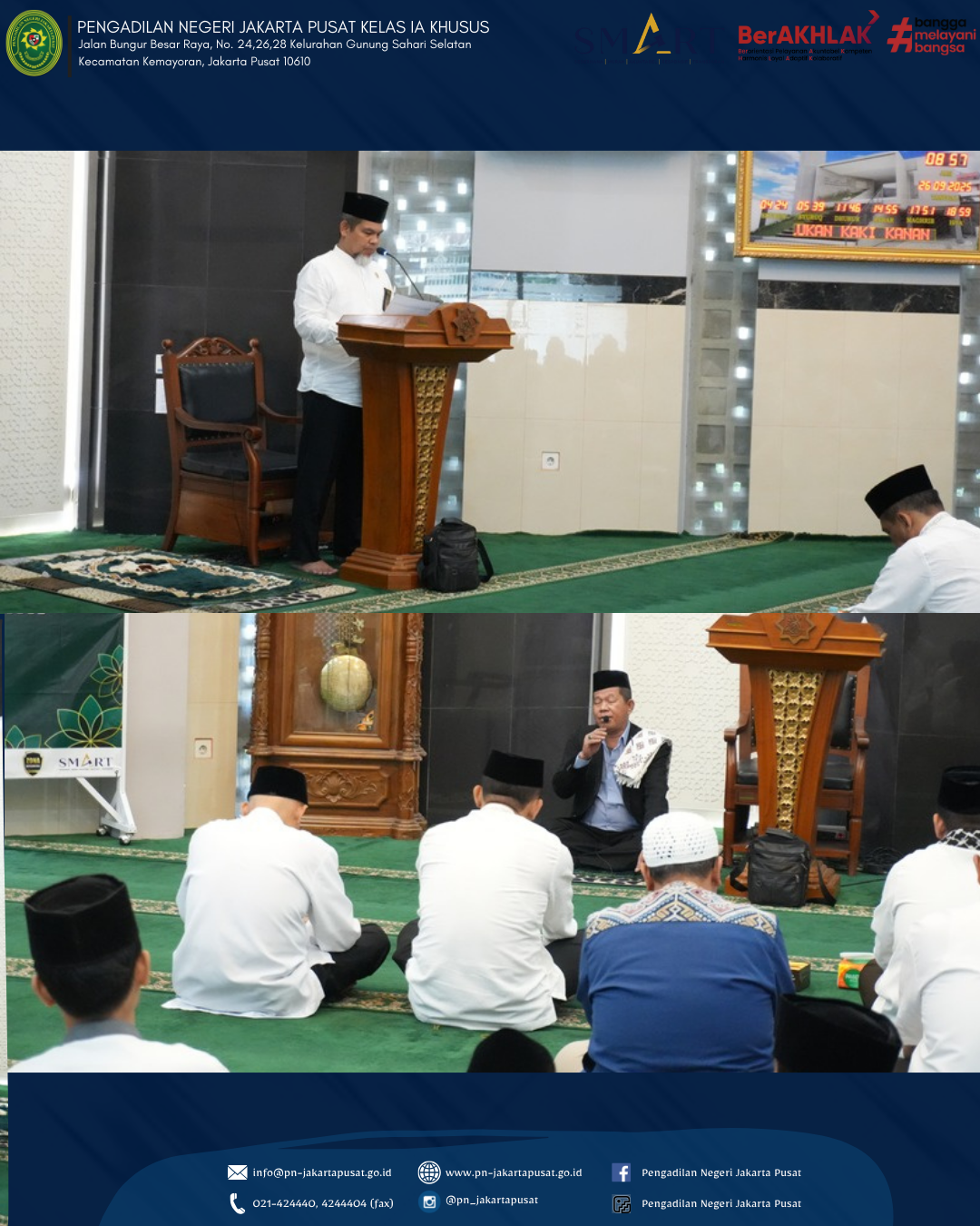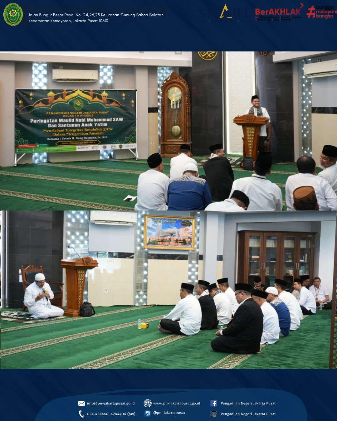Jumat, 29 September 2025 Dalam rangka memperingati Maulid Nabi Muhammad SAW 1447 H, Pengadilan Negeri Jakarta Pusat Kelas IA Khusus melakukan Acara Santunan Anak Yatim dan Peringatan Maulid Nabi Muhammad SAW yang mengusung tema "Meneladani Integritas Rasullah SAW Dalam Mengemban Amanah ". dengan mengundang Ustadz Itang Rusmana, Lc., M.H.
