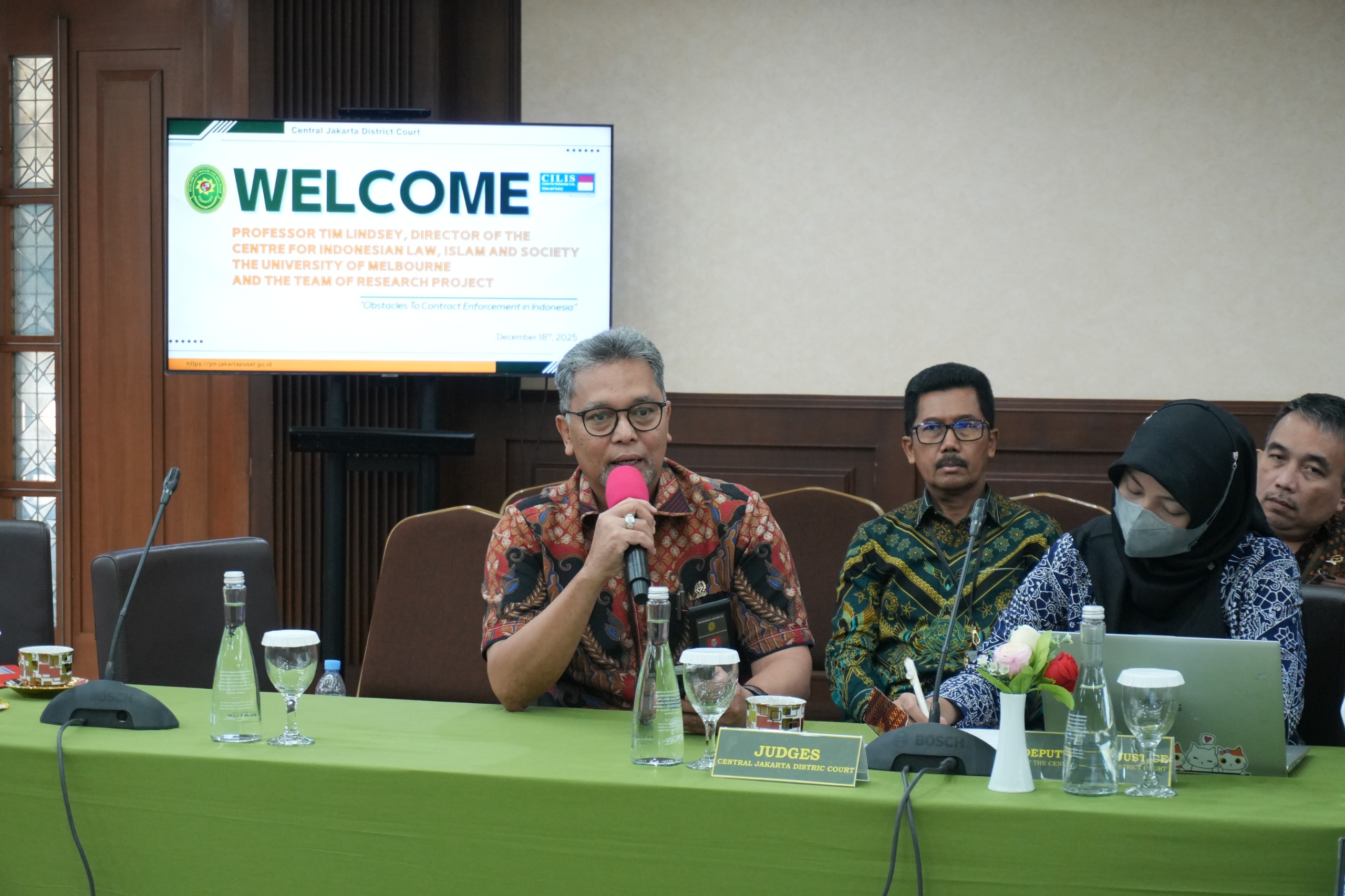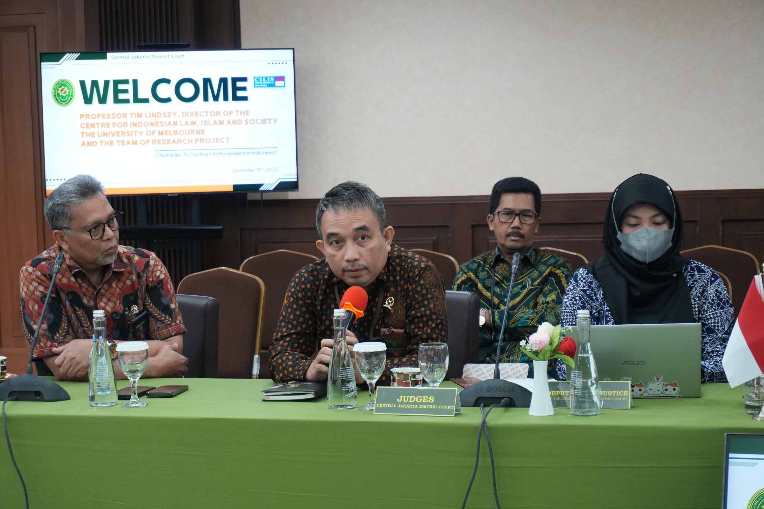 Kamis, 18 Desember 2025 bertempat di Ruang Auditorium Lantai 7 Pengadilan Negeri Jakarta Pusat, Pengadilan Negeri Jakarta Pusat menerima kunjungan penelitian dari Centre for Indonesian Law, Islam and Society (CILIS), Melbourne Law School, Universitas Melbourne, dengan tema “Obstacles to Contract Enforcement in Indonesia”. Acara tersebut dihadiri oleh Ketua Pengadilan Negeri Jakarta Pusat, Ibu Dr. Husnul Khotimah S.H., M.H., Bapak Zeni Zenal Mutaqin, S.H., M.H., Ibu Khusnul Khatimah, S.H., M.H., Bapak Purwanto Purwanto S. Abdullah, S.H., M.H. dan Bapak/Ibu Hakim karier, Panitera Pengganti serta Jurusita pada Pengadilan Negeri Jakarta Pusat.
