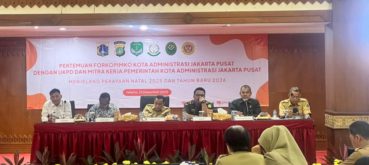 Senin, 22 Desember 2025, Pertemuan Forum Koordinasi Pimpinan Kota (FORKOPIMKO) Kota Administrasi Jakarta Pusat bersama UKPD dan mitra kerja Pemerintah Kota Administrasi Jakarta Pusat digelar dalam rangka persiapan pengamanan menjelang perayaan Natal 2025 dan Tahun Baru 2026. Kegiatan tersebut dihadiri oleh unsur pimpinan daerah serta jajaran terkait guna memperkuat sinergi dan koordinasi lintas sektor.