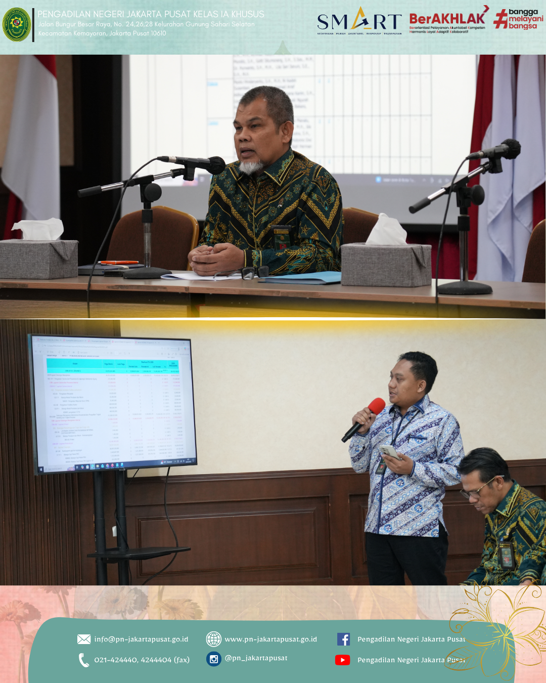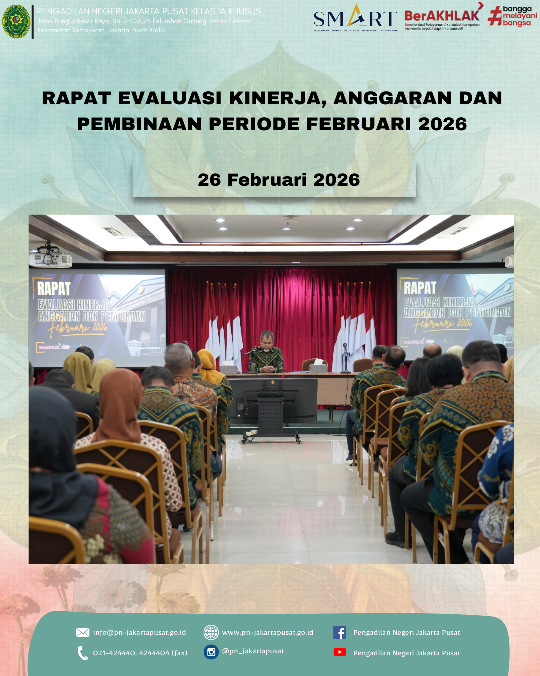 Jakarta, 26 Februari 2026 Pengadilan Negeri Jakarta Pusat melaksanakan Rapat Evaluasi Kinerja, Anggaran, dan Pembinaan Periode Februari 2026 bertempat di Ruang Auditorium Lantai 7 Gedung Pengadilan Negeri Jakarta Pusat. Rapat Evaluasi Kinerja, Anggaran dan Pembinaan Periode Februari 2026 dibuka oleh pembawa acara, Nita Listriyana Hartono Putri, A.Md., dengan penuh khidmat dan tertib. Rangkaian kegiatan diawali dengan menyanyikan lagu Indonesia Raya dan Hymne Mahkamah Agung sebagai wujud penghormatan dan peneguhan semangat kebangsaan. Selanjutnya, acara dilanjutkan dengan pembacaan doa yang dipimpin oleh Saudara Alif Farhan Akbar, S.E., sebagai harapan agar seluruh rangkaian kegiatan dapat berjalan dengan lancar, khidmat dan penuh keberkahan.