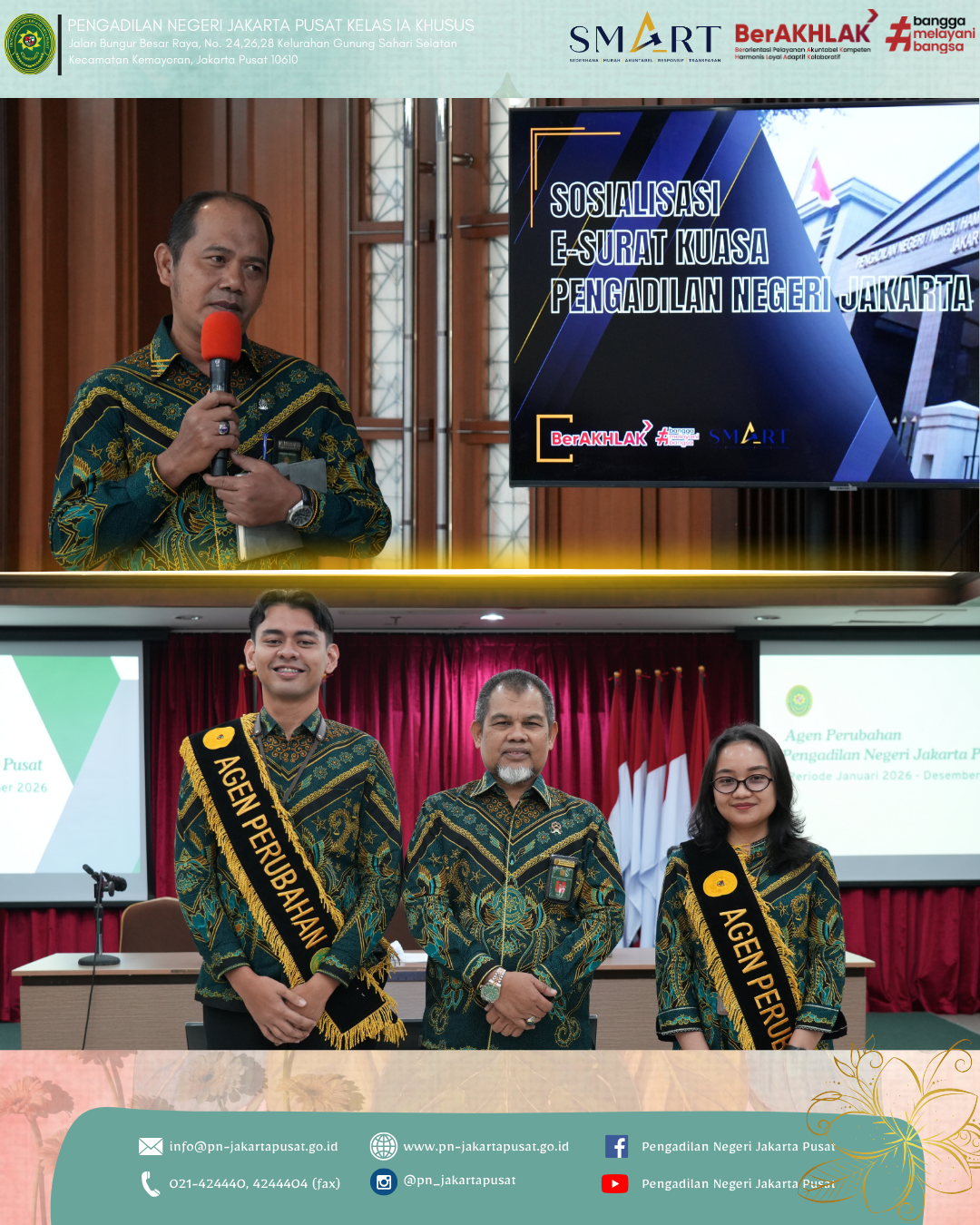 Kegiatan ini menjadi momentum strategis dalam memperkuat kualitas kinerja dan tata kelola organisasi, yang diisi dengan Pemaparan hasil pengawasan bidang sebagai bahan evaluasi dan perbaikan berkelanjutan dan Pembinaan oleh Wakil Ketua Pengadilan Negeri Jakarta Pusat, Bapak Efendi, S.H., yang menegaskan pentingnya integritas, profesionalitas dan tanggung jawab dalam menjalankan tugas peradilan. Kemudian rapat dilanjutkan dengan Monitoring dan evaluasi DIPA 01 dan DIPA 03 yang disampaikan oleh Kepala Sub Bagian Umum dan Keuangan, Bapak Lutfi Sukowati Ilyasa, S.H., M.H. Selanjutnya acara dilanjutkan dengan Pengukuhan Agen Perubahan Pengadilan Negeri Jakarta Pusat, yaitu Yola Pathresya Munthe, A.Md. dan Isvid ST Hanif, S.H. sebagai motor penggerak perubahan menuju peradilan yang lebih baik dalam mewujudkan budaya kerja yang inovatif dan berintegritas. Adapun Rangkaian acara selanjutnya yaitu Sosialisasi inovasi layanan E-Surat Kuasa oleh Panitera Muda Hukum, Bapak Sutrisno, S.H., M.H., sebagai upaya peningkatan layanan berbasis teknologi.