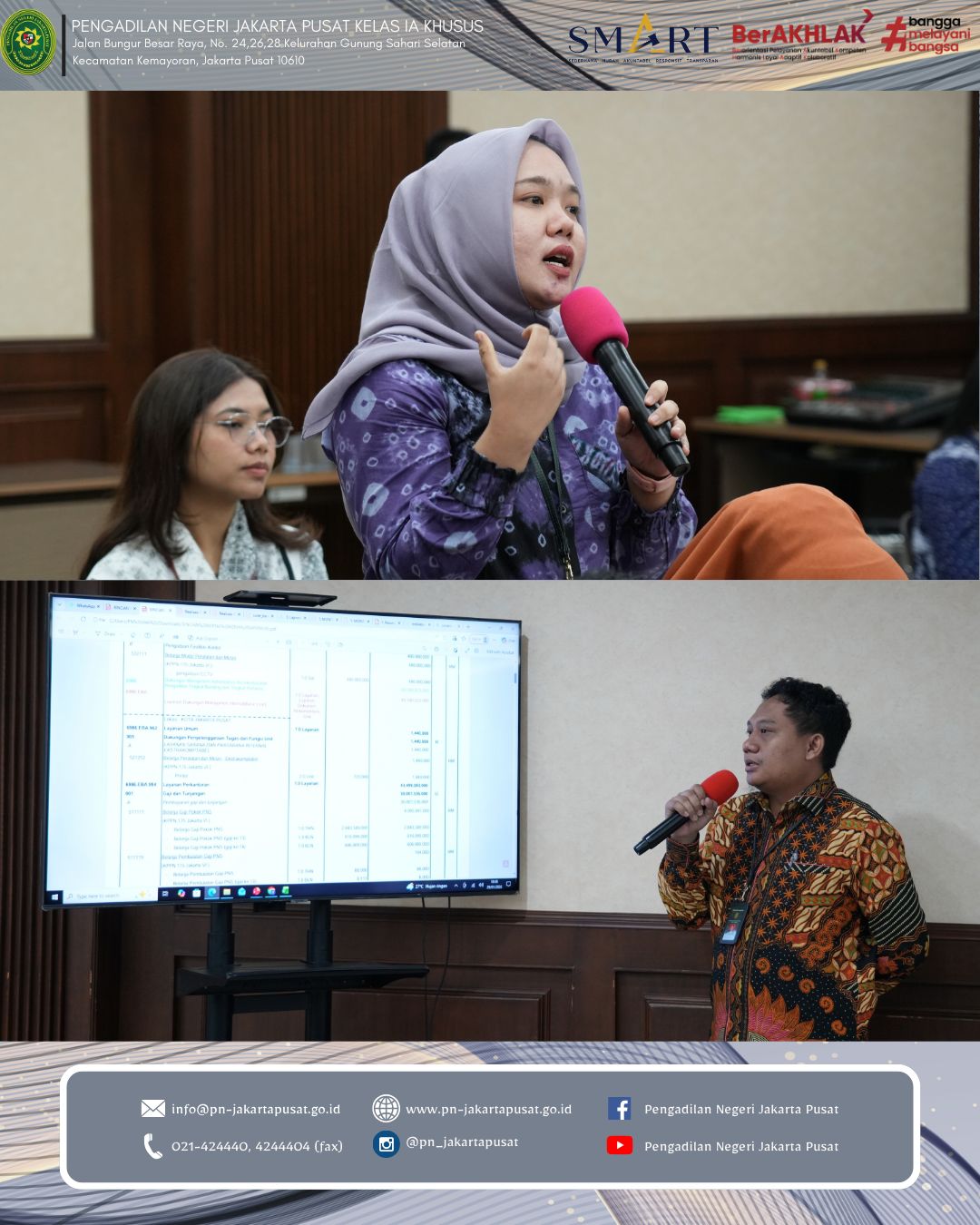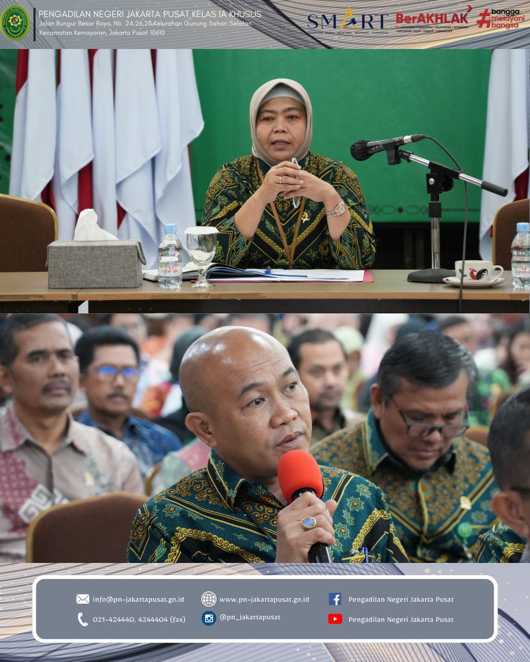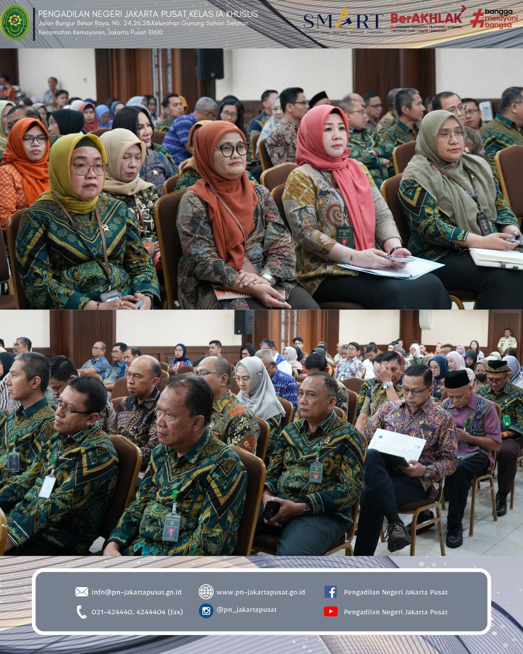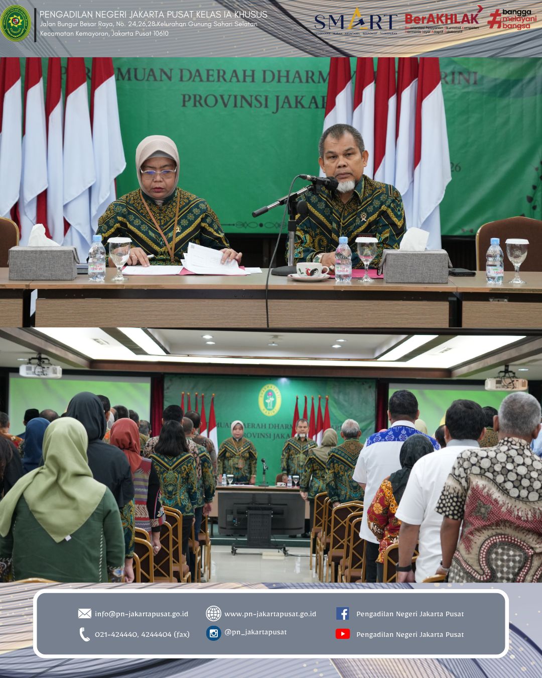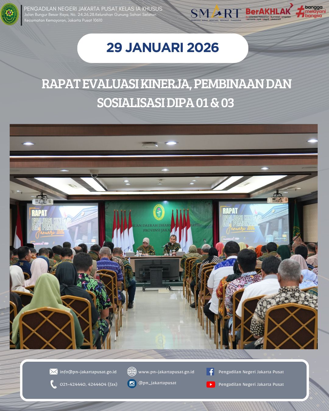 Jakarta, Kamis 29 Januari 2026 bertempat di Ruang Auditorium Lantai 7 Pengadilan Negeri Jakarta Pusat. Pengadilan Negeri Jakarta Pusat melaksanakan Rapat Evaluasi Kinerja dan Pembinaan Bulan Januari 2026. Kegiatan ini menjadi wujud nyata komitmen berkelanjutan dalam meningkatkan kualitas kinerja, memperkuat integritas serta meneguhkan profesionalisme seluruh aparatur peradilan.