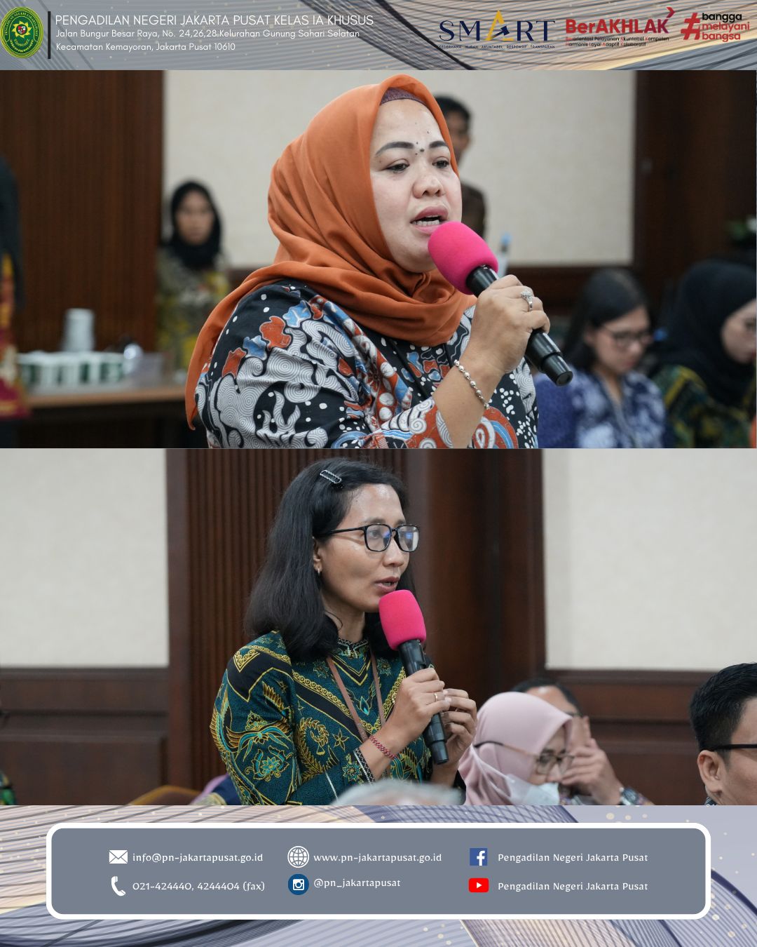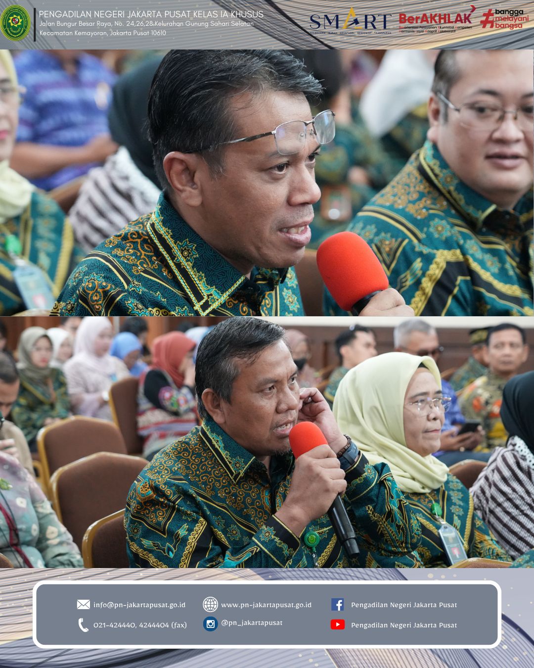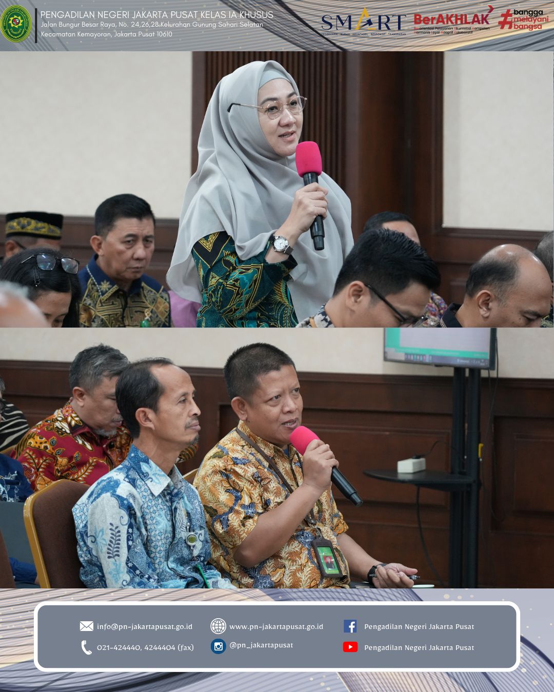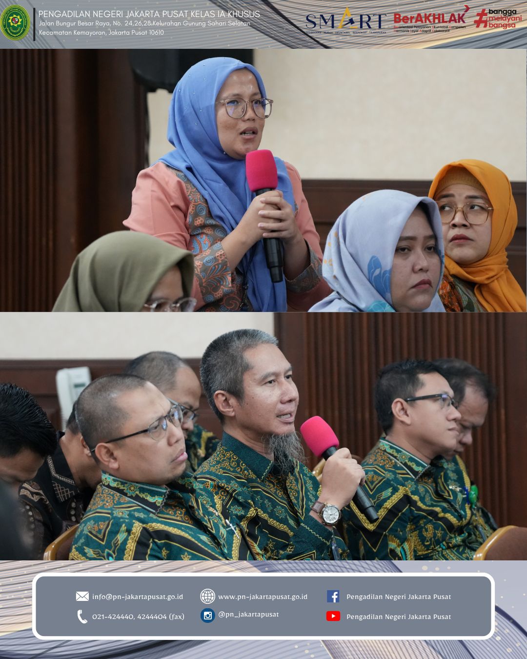 Melalui kegiatan ini, diharapkan seluruh aparatur Pengadilan Negeri Jakarta Pusat senantiasa menjaga semangat peningkatan kinerja, menjunjung tinggi nilai-nilai integritas dan akuntabilitas serta terus berinovasi dalam memberikan pelayanan peradilan yang prima, transparan dan berkeadilan kepada masyarakat.