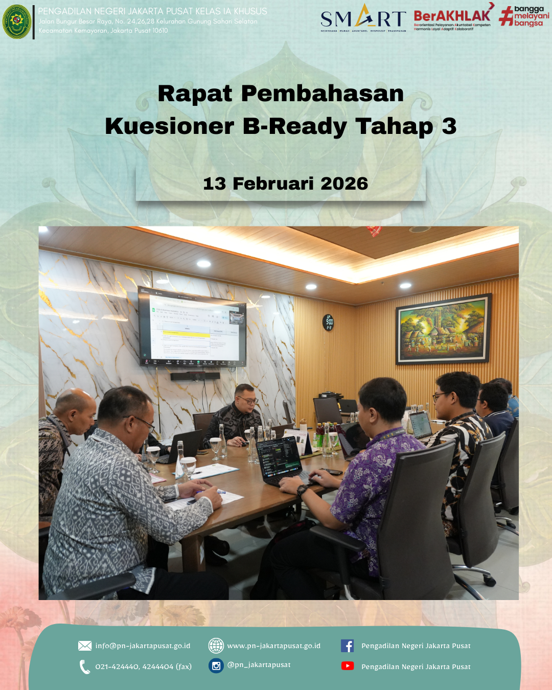 Jakarta, Jumat 13 Februari 2026. Pengadilan Negeri Jakarta Pusat melaksanakan Rapat Pembahasan Kuesioner B-Ready Tahap 3 sebagai bagian dari rangkaian persiapan pengisian kuesioner bersama Kementerian Investasi dan Hilirisasi/BKPM Republik Indonesia yang dijadwalkan berlangsung pada 20 Februari 2026.