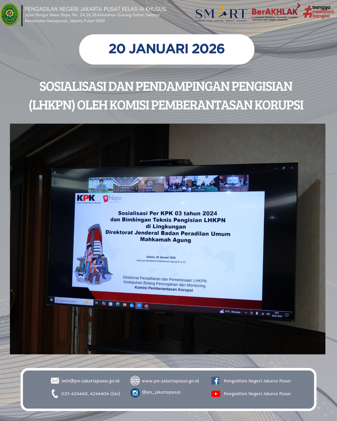Jakarta, 20 Januari 2026 – Dalam upaya memperkuat transparansi dan akuntabilitas aparatur peradilan, Pengadilan Negeri Jakarta Pusat mengikuti kegiatan Sosialisasi dan Pendampingan Pengisian Laporan Harta Kekayaan Penyelenggara Negara (LHKPN) yang diselenggarakan oleh Komisi Pemberantasan Korupsi (KPK). Kegiatan ini dilaksanakan secara daring melalui platform Zoom.